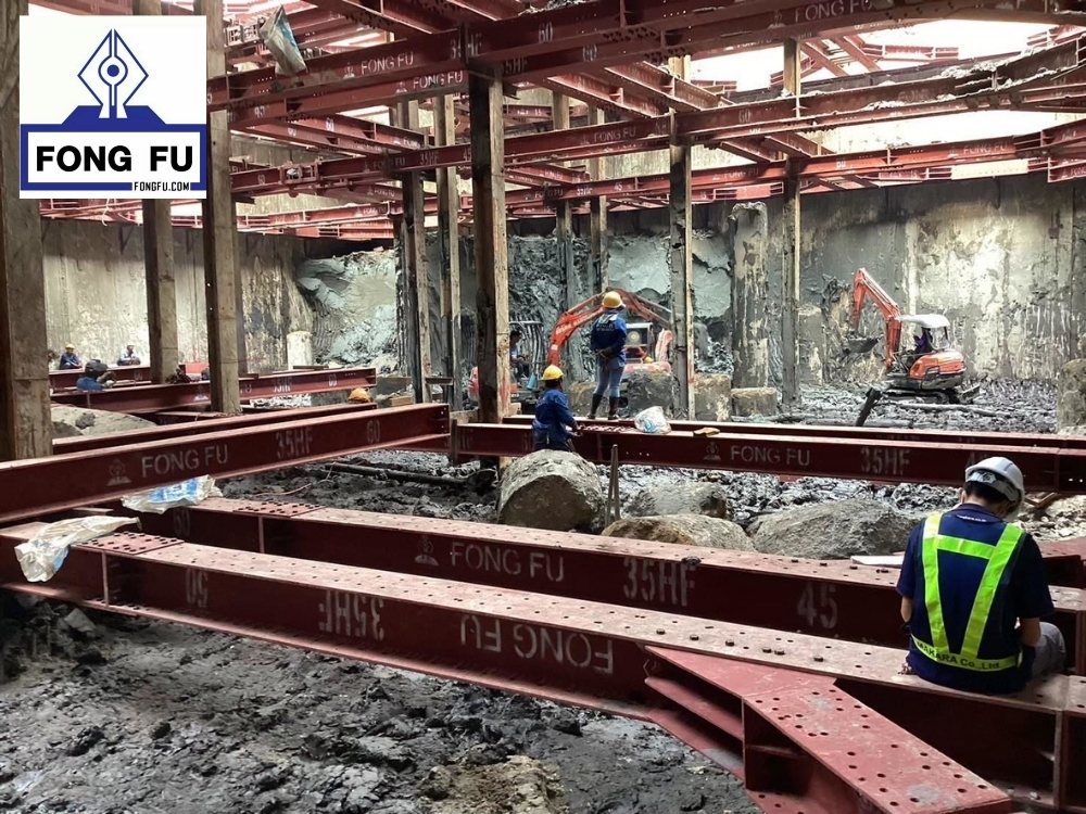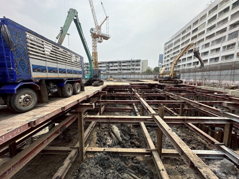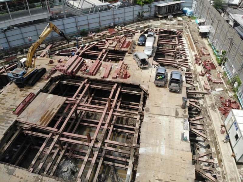 • ระบบป้องกันดินพังครบวงจร (Soil Protection System): ออกแบบและติดตั้ง Bracing System (H-Beam 300-400) พร้อมระบบ Hydraulic Jack